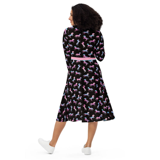 Ken Pink and Blue Barbie Horses Long Sleeve Midi Dress