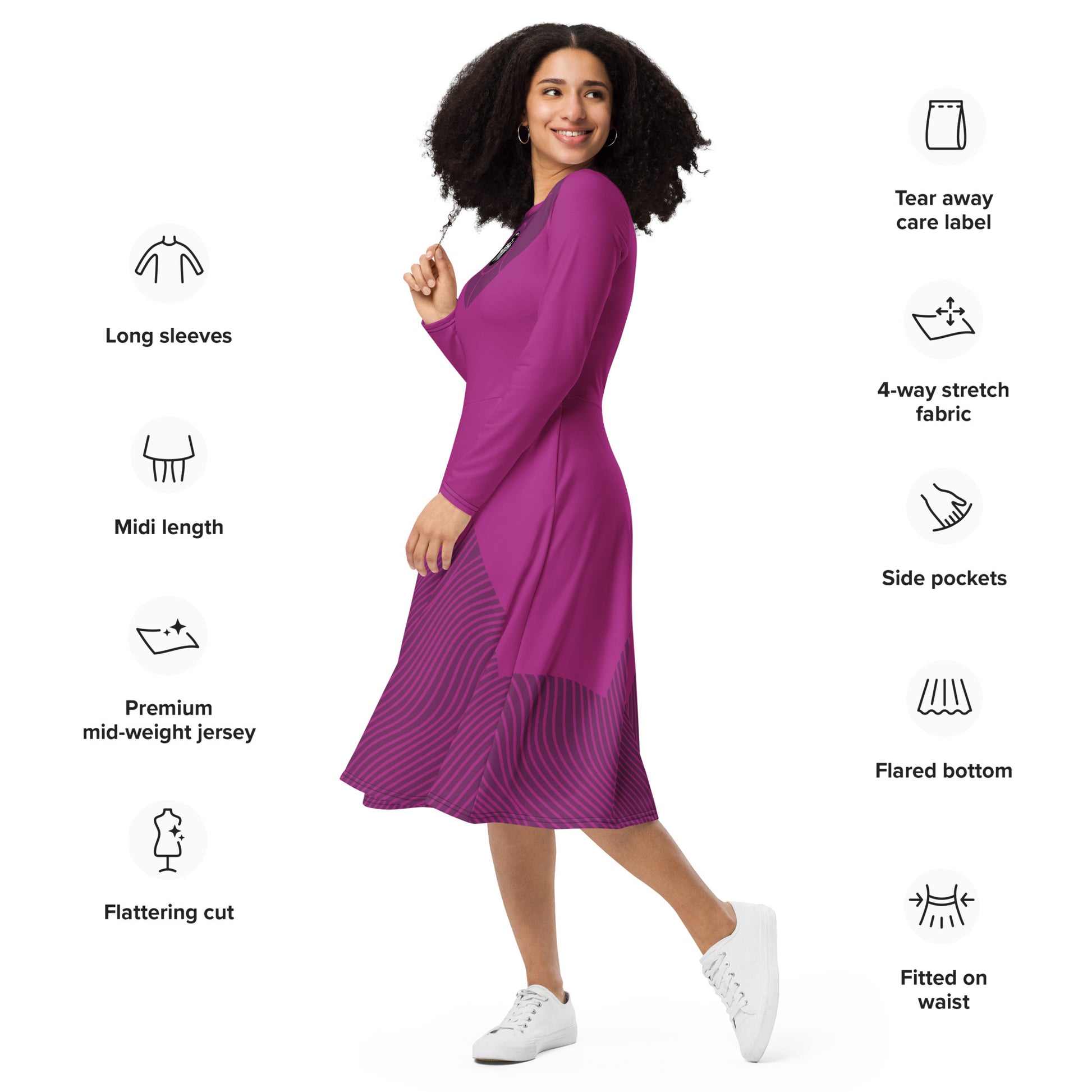 Meet your new favorite dress! Its soft fabric and flattering cut will ensure you feel comfortable and feminine all day long. Plus, the fitted waist and flared bottom part of the dress will accentuate the wearer’s naturally beautiful silhouette. The best part about the dress? It. Has. Pockets.