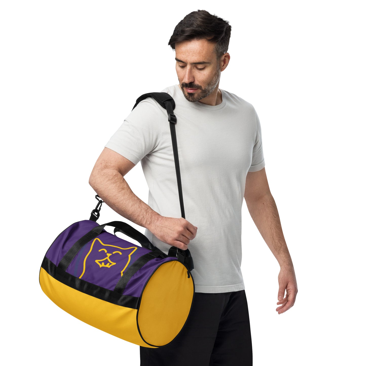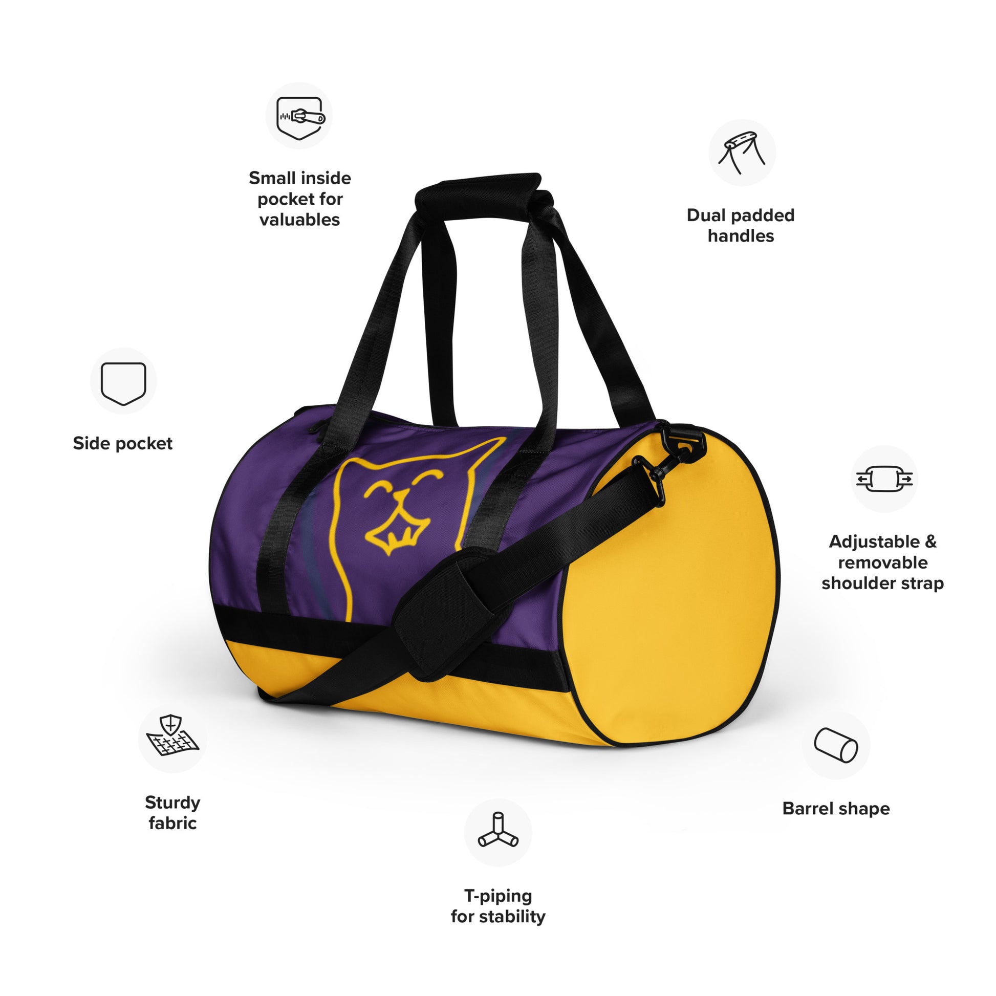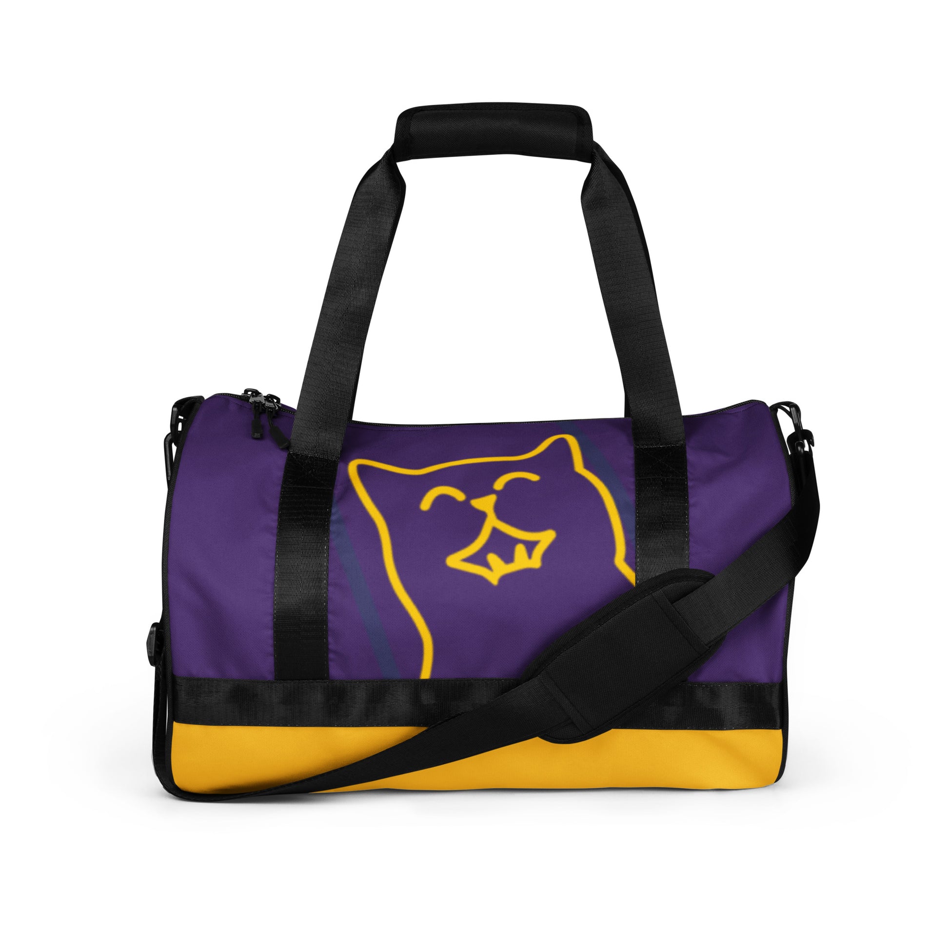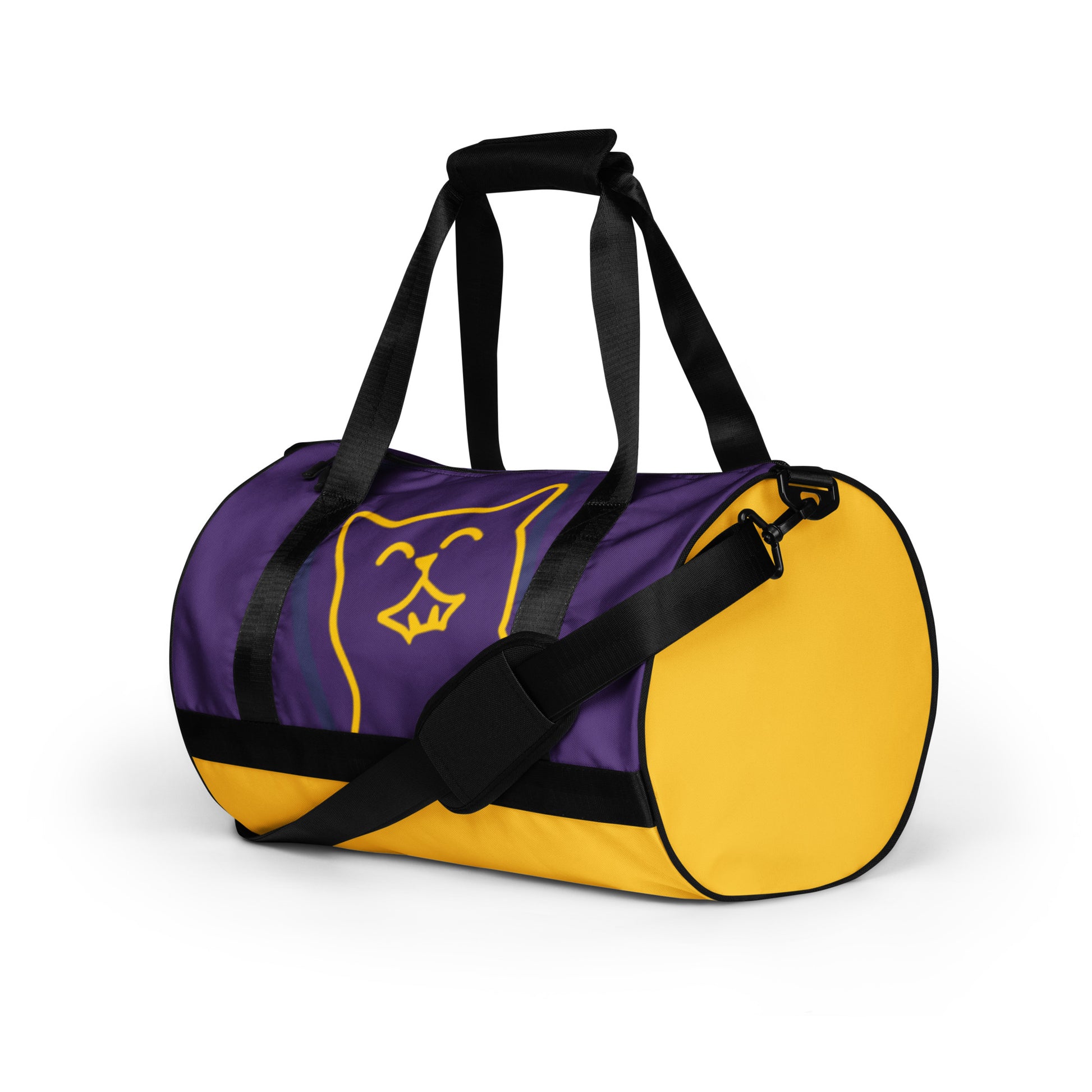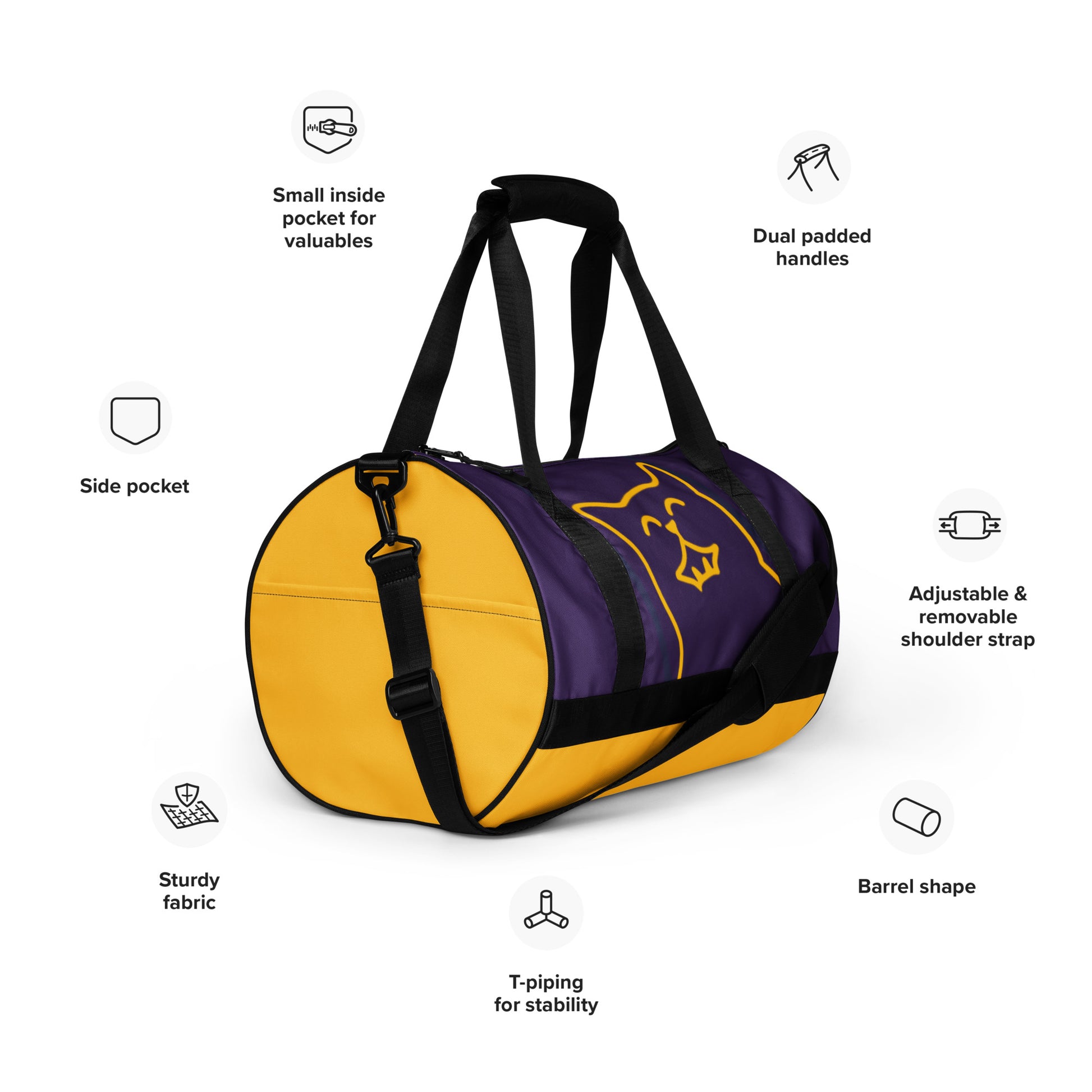 Ready to get your fitness on? Add some punch to pumping iron with this all-over print gym bag. Made from 100% polyester and sturdy, water-resistant fabric, this bag is fun meets function. And it’s got pockets!