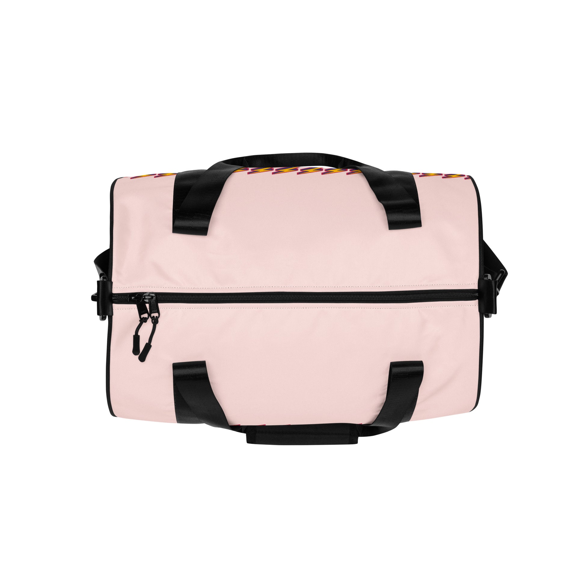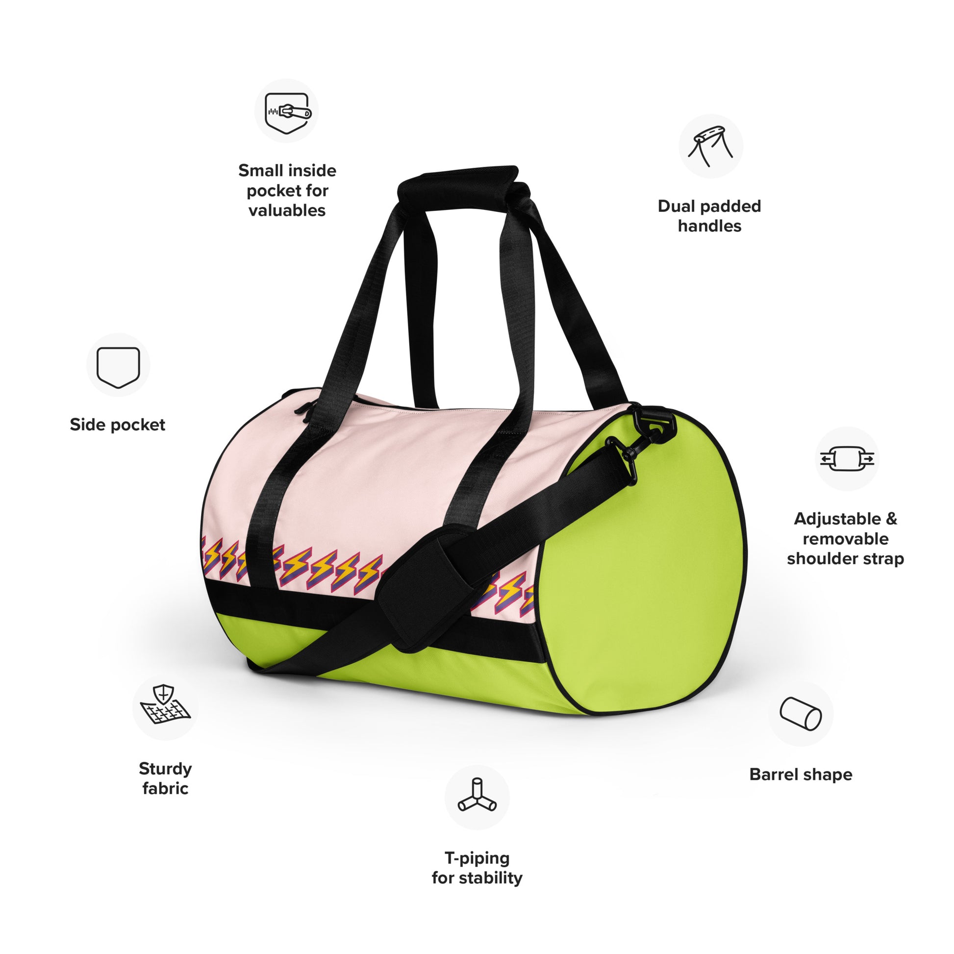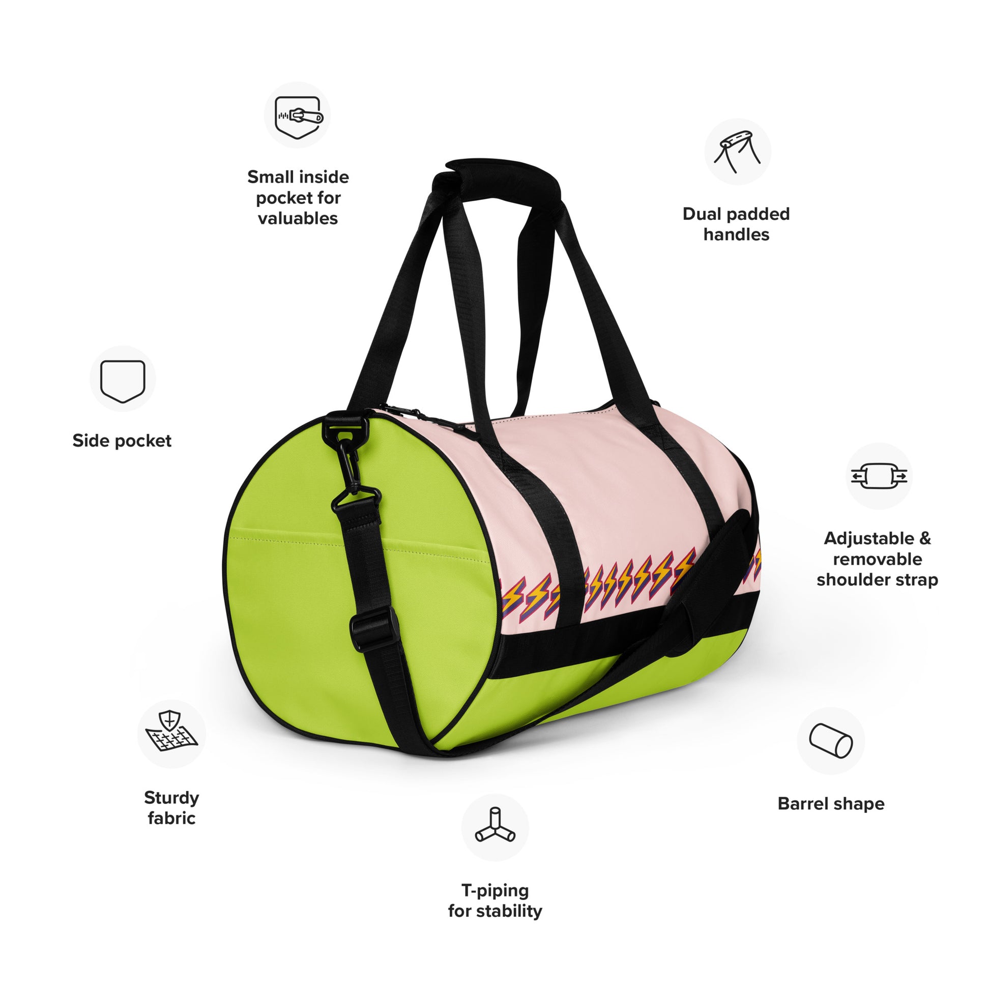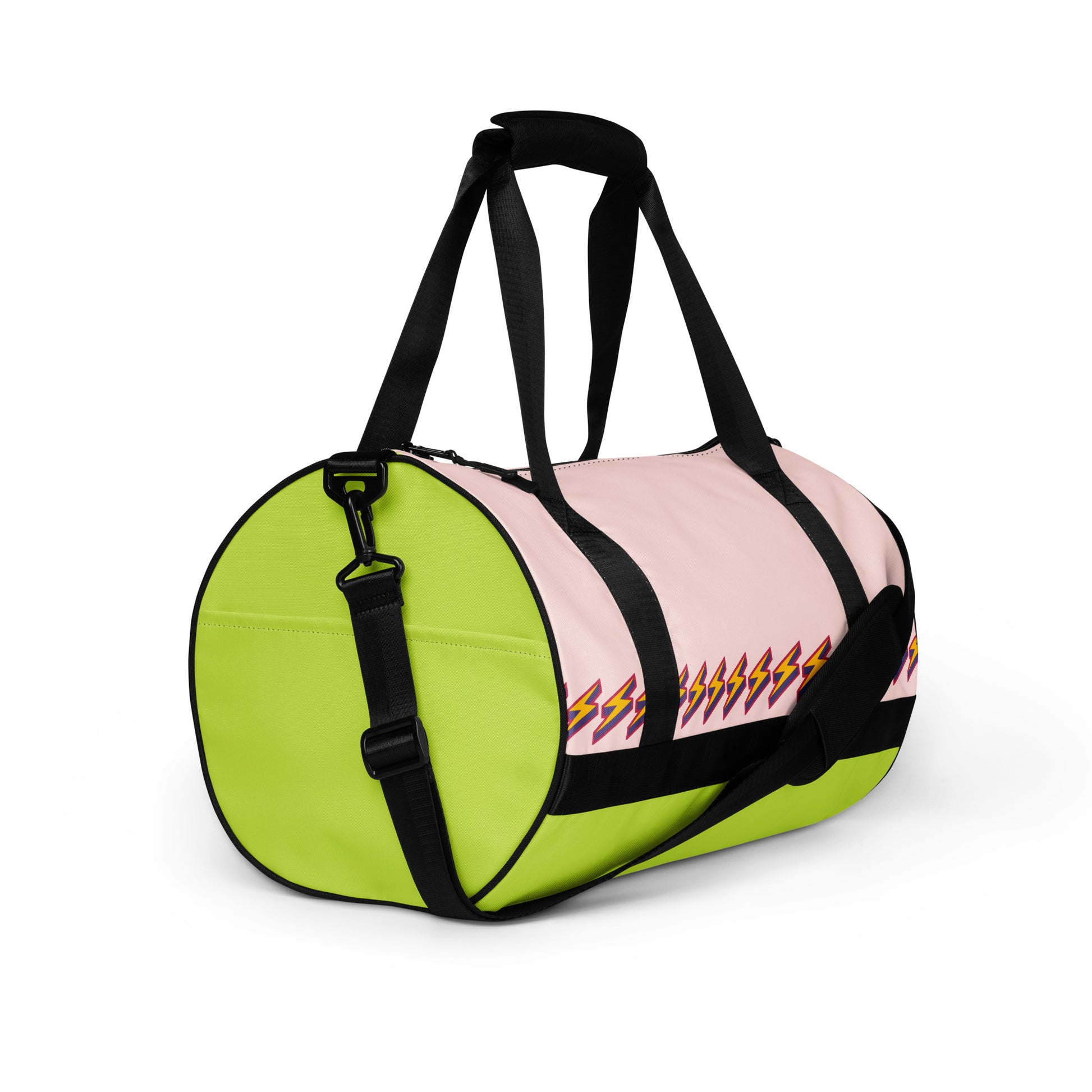 Ready to get your fitness on? Add some punch to pumping iron with this all-over print gym bag. Made from 100% polyester and sturdy, water-resistant fabric, this bag is fun meets function. And it’s got pockets!